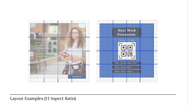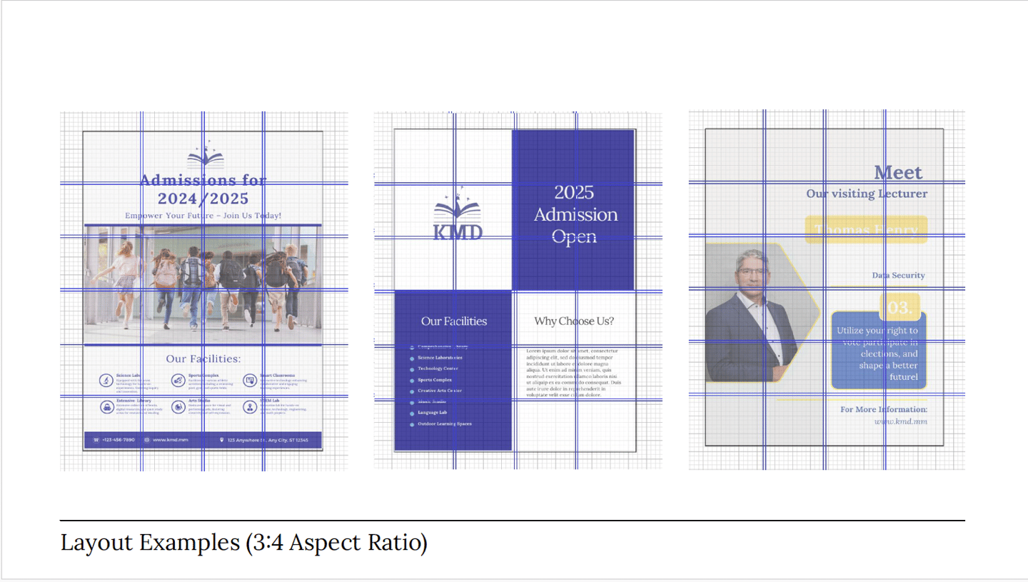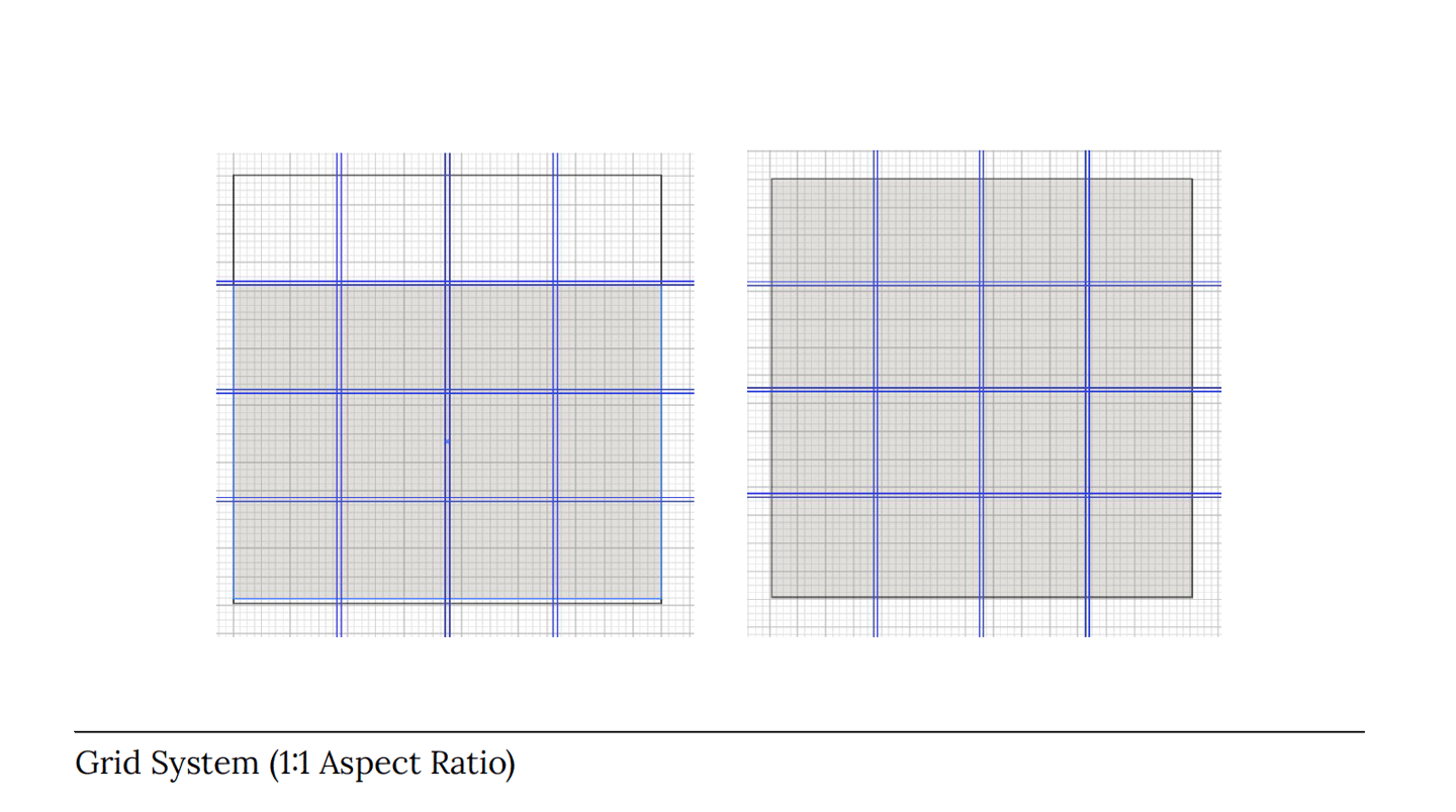 To ensure optimal user experience and visual harmony, a flexible yet structured grid system was developed for various aspect ratios (9:16, 16:9, 3:4, and 1:1). These grids provide a consistent framework for arranging content, images, and interactive elements across all digital and print applications, from social media posts to website pages and presentations.