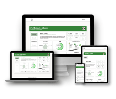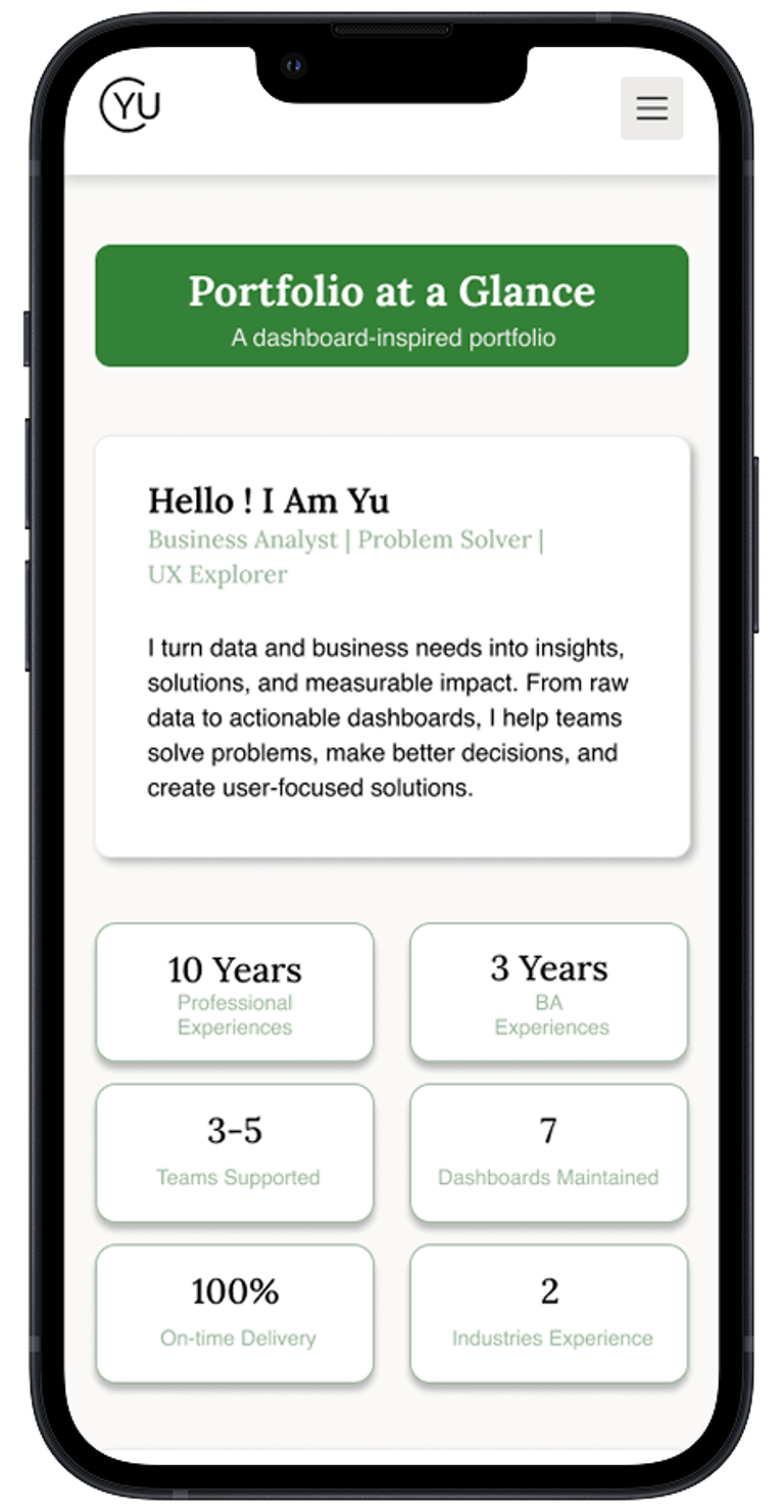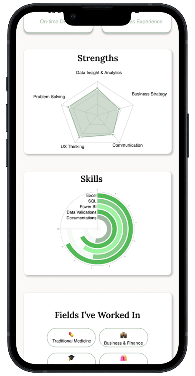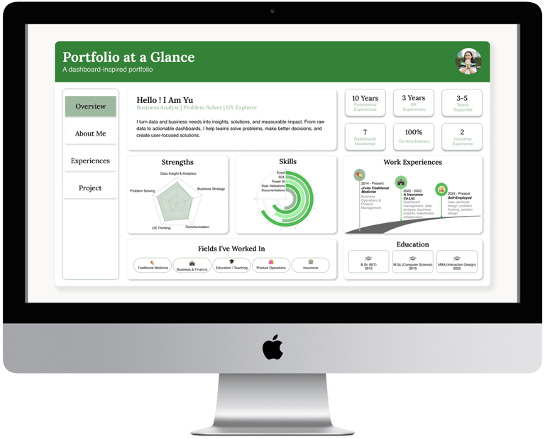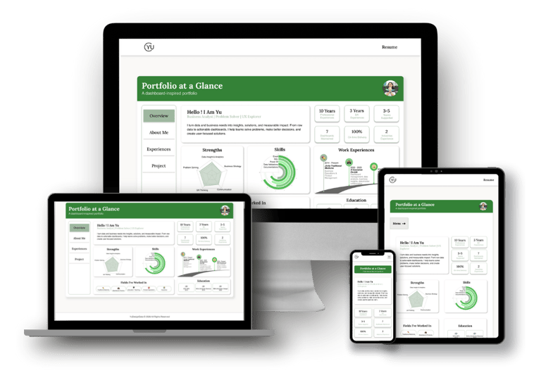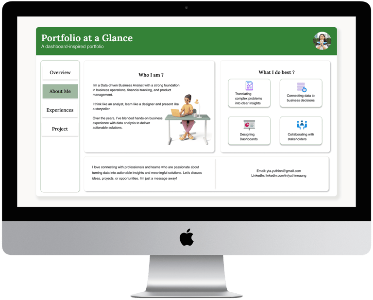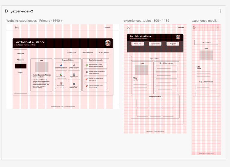 The result is a responsive portfolio that combines functionality with personality. On the desktop version, the homepage is a dashboard, showing her main metrics, skill highlights, and key achievements as clean KPI cards and simple charts. The homepage acts as a dashboard with KPI cards and simple charts, framing three main sections: Home (Dashboard), About Me, and Experiences. Users can switch between these within the dashboard, keeping the experience cohesive.