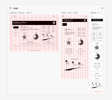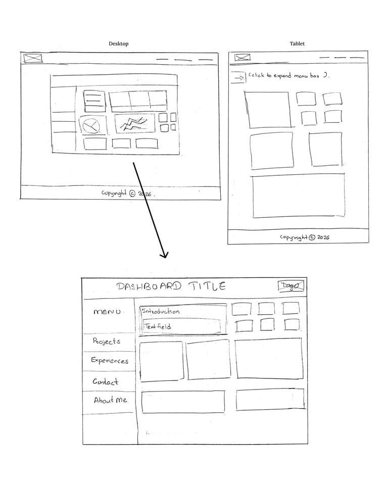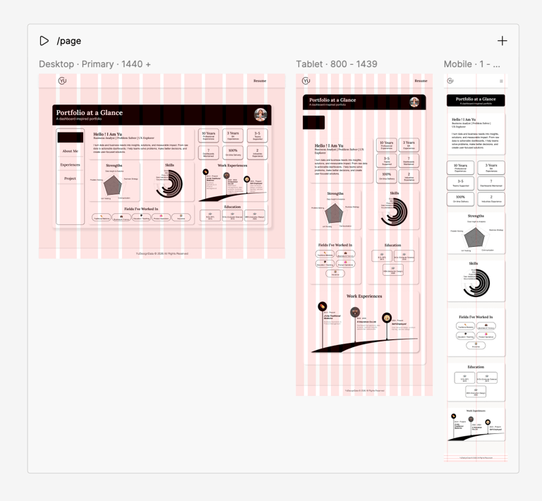 We spent three full days exploring different directions for the portfolio layout. We wanted something that would attract attention without feeling either too modern and flashy or too traditional and rigid. After multiple discussions, sketches, and iterations, we arrived at an idea we both loved: a portfolio designed like a dashboard. It was perfect because the client day-to-day work revolves around dashboards and data visualization. But we also wanted it to be inviting for visitors who might not love overly “nerdy” or data-heavy designs.