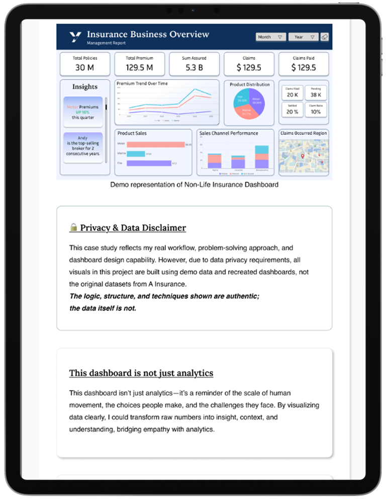 One of the main challenges of this project was responsiveness. The dashboard layout was designed primarily for desktop use and works best at a 16:9 ratio. Instead of forcing the full dashboard to scale down for smaller screens, we made a conscious decision to prioritize core content and KPIs using a card-based layout for tablet and mobile. While the structure changes across devices, the essence of the dashboard remains—something the client appreciated, as it closely reflects her work in Power BI and analytics.